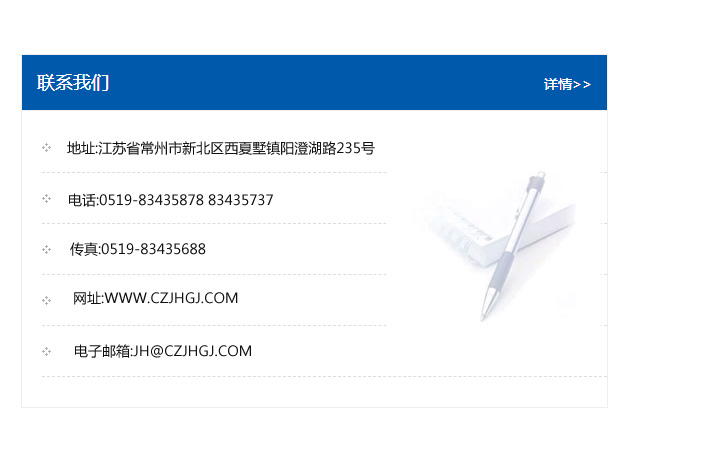 地址:常州市新北區友邦商務大廈1幢16、17層  電話:0519-85101652  傳真:0519-85112595  郵編:213022  網址:www.cz-jiayue_cn.kpodin.com  郵箱:xiajifengaa@163.com